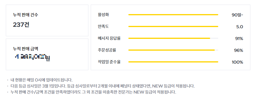 실제로는 수익관리 탭에서 판매건수보다 전문가 등급에서 판매건수가 약간 낮게 책정되는데 기준은 잘 모르겠습니다만, 조만간 300건이 넘어서 마스터 등급이 된다면 또 어떤 영향을 미칠지 비교하러 돌아오겠습니다!